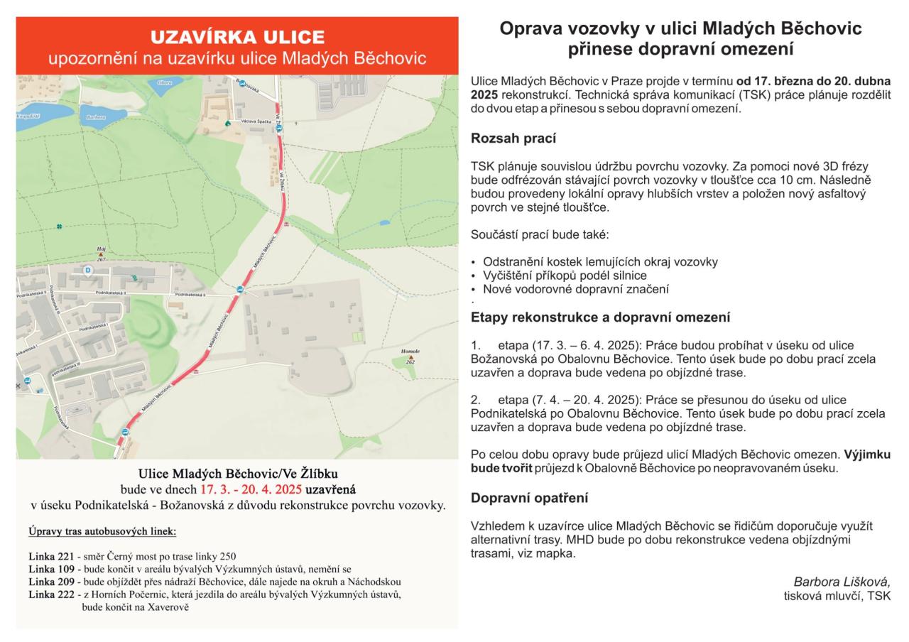 Po celou dobu opravy bude průjezd ulicí Mladých Běchovic omezen. Výjimku bude tvořit průjezd k Obalovně Běchovice po neopravovaném úseku. Více se dozvíte v letáčku Typ: PDF dokument, Velikost: 8.49 MB